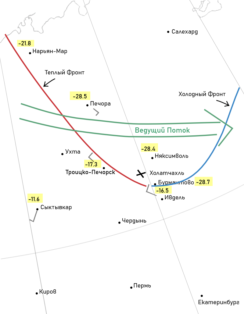 В результате анализа климатической обстановки Мошиашвили установил, что фронт холодного воздуха шел с северо-запада на юго-восток, причем зона холодного воздуха не проникла далеко на юг, и на уровне Троицко-Печорского и Ивделя температура не падала ниже минус 20 градусов. Но немного севернее и восточнее – в Печоре, Няксемволе и в Бурмантово отмечен пик падения температуры до минус 28. Показания именно этих метеостанций определяют наиболее точно температуры в точке аварии. При этом возможные отклонения пика температуры в зоне аварии составляют плюс-минус 2-3 градуса. Прохождение фронта было достаточно быстрым, - со скоростью около 40 км в час, поэтому проследить его оказалось возможным только по 6-часовым показаниям метеостанций (по суточным температурам прохождение фронта не отслеживалось). Холодный фронт прошел в течение примерно 10 ночных часов 1-2 февраля, причем пик падения температур наблюдался в районе нуля – двух часов по Гринвичу, т.е. в 5.00 – 7.00 утра по Свердловскому времени. Прохождение фронта сопровождалось сильным ветром западного и северо-западного направления со скоростью не менее 10-15 м/с с азимутального направления 270-290°. Существенного выпадения осадков не могло быть, но усиление ветра могло вызвать повышенный сдув свежего снега с гор, сильную поземку и «низовую метель» из ранее выпавшего снега. В зоне главного хребта на восточной стороне могло наблюдаться явление типа «бора», - падение тяжелого холодного воздуха вниз при перевале им хребта с усилением ветра даже до ураганной силы в 20-30 м/c ниже хребта. Такой была погода в зоне аварии по результатам анализа Мошиашвили.