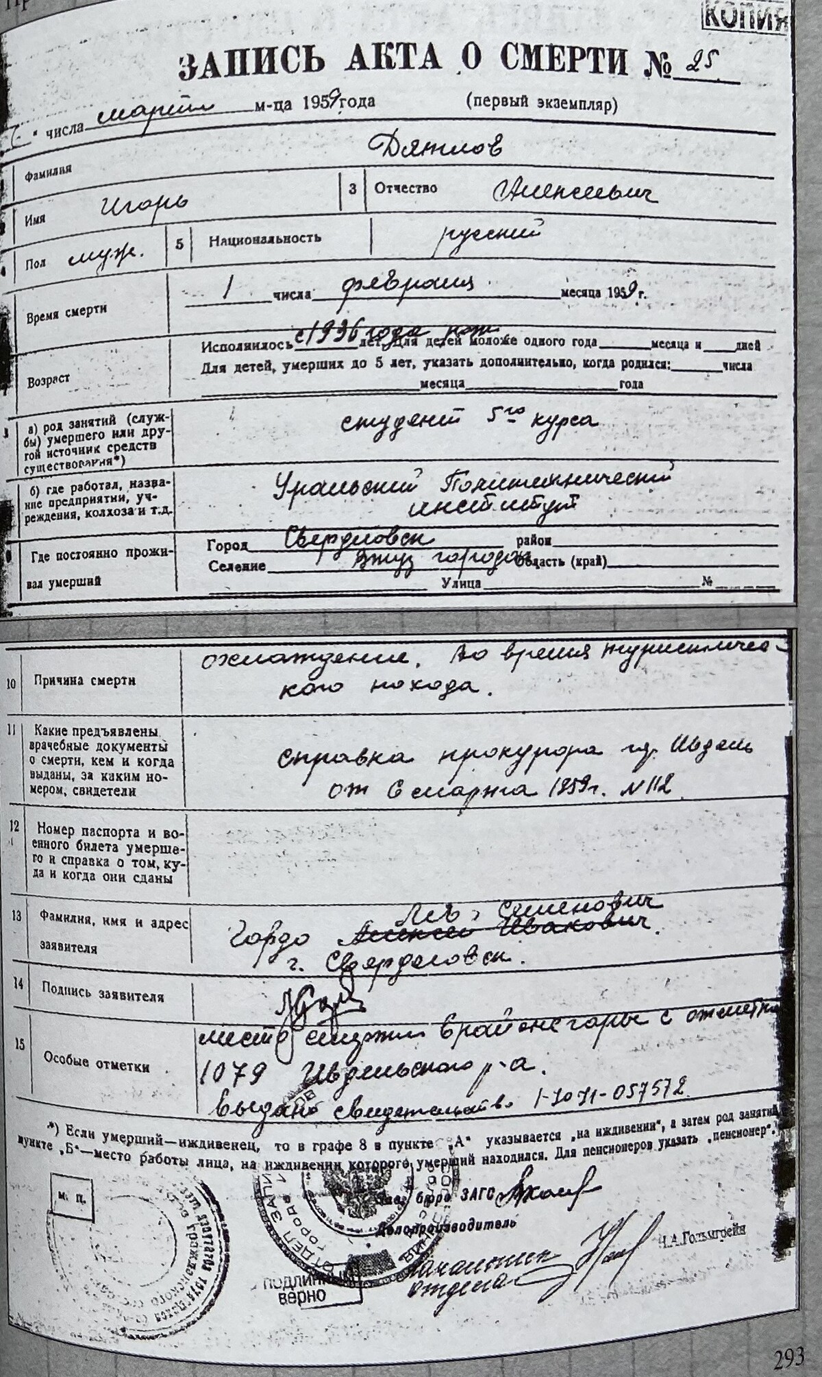 He was 23 years old when he died. Dyatlov is buried on March 10, 1959, in Mihaylovskoe cemetery, Yekaterinburg, Sverdlovsk Oblast, Russia.